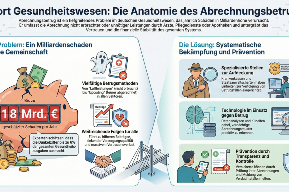 Der Abrechnungsbetrug im deutschen Gesundheitswesen stellt ein anhaltendes Problem dar, das jährlich erhebliche finanzielle Schäden verursacht und das Vertrauen in das System untergräbt. Im Jahr 2024 erreichten die gemeldeten Schäden bei einzelnen Krankenkassen neue Höchstwerte, während Schätzungen auf eine hohe Dunkelziffer hinweisen. Das Phänomen umfasst eine Vielzahl von Praktiken, bei denen Leistungen abgerechnet werden, die nicht erbracht oder nicht notwendig waren. Betroffen sind alle Bereiche des Gesundheitswesens, von der ambulanten Pflege über Apotheken bis hin zu Krankenhäusern. Die gesetzlichen Regelungen zielen auf eine strengere Kontrolle ab, doch die Komplexität des Systems ermöglicht weiterhin Missbrauch. Im Folgenden wird das Thema detailliert beleuchtet, basierend auf etablierten Fakten zu Definitionen, Formen, Statistiken, Auswirkungen und Bekämpfungsstrategien.