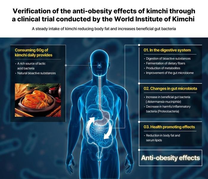 In Fortsetzung dieser Untersuchung konzentrierte sich eine Forschungsstudie eines Teams unter der Leitung von Dr. Sung-Wook Hong von der Kimchi Functionality Research Group am World Institute of Kimchi in Zusammenarbeit mit dem Pusan National University Hospital (Südkorea) auf die Anti-Adipositas-Wirkung von Kimchi und dessen Einfluss auf das Darmmikrobiom. In dieser Studie wurden die Veränderungen bei anthropometrischen Maßen, Blutbiomarkern und Darmmikrobiomen bei 55 übergewichtigen erwachsenen Männern und Frauen mit einem BMI zwischen 23 und 30 kg/m² untersucht. Die Teilnehmer nahmen drei Monate lang drei Kimchi-Kapseln pro Mahlzeit ein (60 g Kimchi pro Tag). Die Kimchi-Kapseln enthielten Kimchi-Pulver, das durch gefriergetrocknetes, zwei Wochen lang bei 4 °C fermentiertes Kohl-Kimchi hergestellt wurde. Das Forschungsteam analysierte die Veränderungen in der Körperfettzusammensetzung der Teilnehmer und fand heraus, dass die Gruppe, die Kimchi konsumierte, einen Rückgang des Körperfetts um 2,6 % aufwies, während die Kontrollgruppe, die keine Kimchi-Kapseln einnahm, eine Zunahme des Körperfetts um 4,7 % aufwies. Dies zeigt einen statistisch signifikanten Unterschied zwischen den beiden Gruppen.